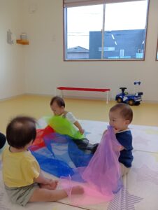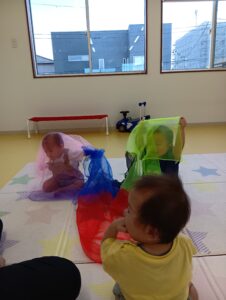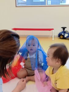 布を触ったりなめたり、オーガンジーの感触も楽しんでいる様子も見られました♪