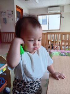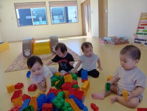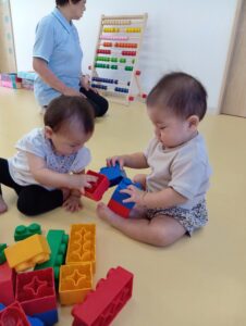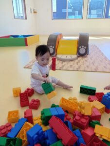 ブロック遊びではブロックを重ねてみたり、お友だちが使っているものに興味を持って手を伸ばしたり、、、