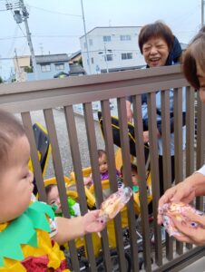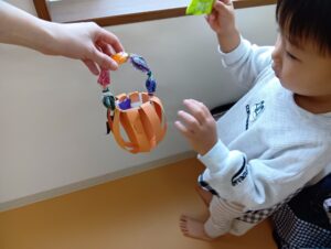 みんなで上手に『トリック オア トリート』も言えてお菓子やネックレスをもらいました!大事に大事に保育園まで持って帰ってきましたよ😍🎵