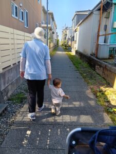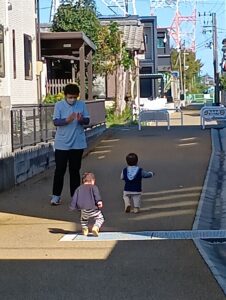 この日は遊歩道へ。しっかりと手を繋いでよちよち歩いています❤