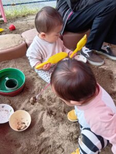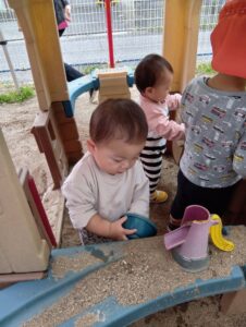 園庭でも沢山遊びました!そら組のみんなは最近お砂遊びに夢中で、スコップでお砂をほりほりして楽しんだり、お茶碗にお砂を盛ってそれをひっくり返し、砂がジャーッと落ちていくのを楽しんだりしています!お洋服はいつもお砂だらけ!いっぱい遊んでいる証拠ですね😄