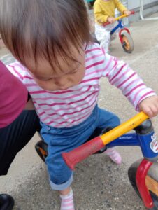 三輪車に挑戦しているおともだち。ハンドルをしっかり握ってもう片方は保育者につかまって~いざ、出発!慎重に進んでいく姿が健気で可愛かったです💗
