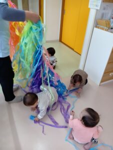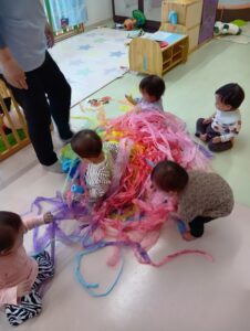 次はお部屋遊び。この日はスズランテープで思いきり遊びました!大量のスズランテープの中に入って「きゃー!」と楽しむ子や好きな色のテープを引っ張ったりくしゃくしゃと握って音を楽しんだりしていました💗