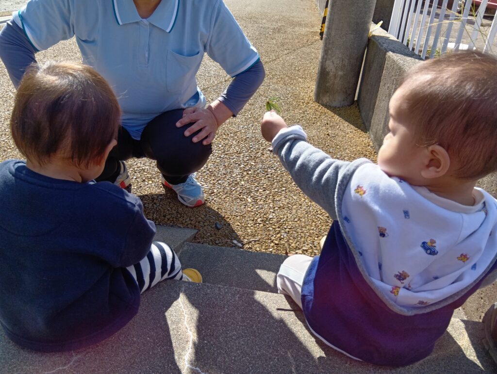ぶどうや柿ができているのを見て「お!お!」と指をさして教えてくれる子どもたち。みんなにとってお外は大冒険のようです!👒