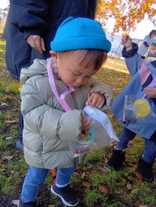 見つけたどんぐりは、自分でお散歩バッグにいれました。