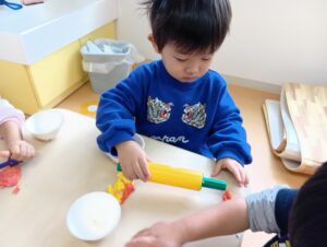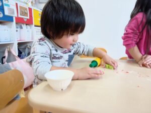 色を混ぜてみたり、型抜きや黄色の卵に赤色の粘土を乗せオムライスの完成!!!