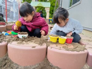 園庭遊ではご飯作りに夢中・・・「先生のためにから揚げ作るからね~」とから揚げをあげてくれました✨