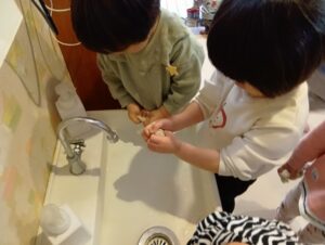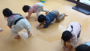 雑巾絞りにも挑戦!「みて~しぼれた😆😆😆」と得意気な子どもたちでした!