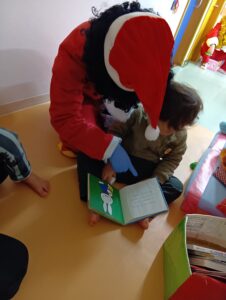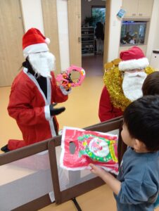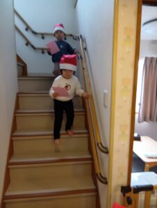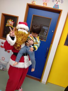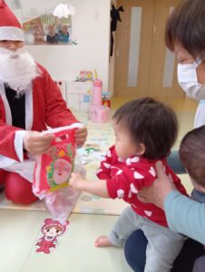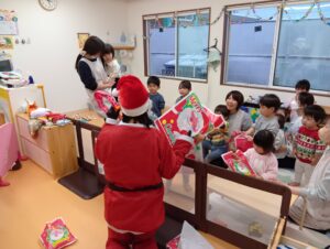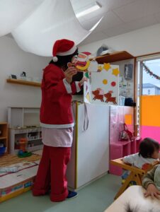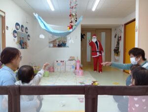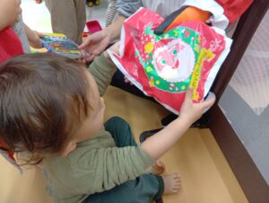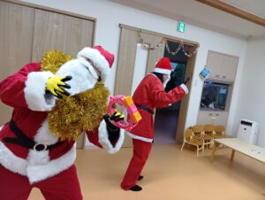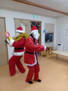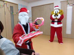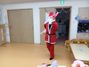 おやつ後はサンタさん登場の場面も!二体のサンタさんがみんなの分のプレゼントを持ってきてくれました!