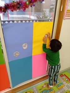 みんながデコレーションしてくれたたくさんのイラストは、カラフルな画用紙を組み合わせてステンドグラスに見立てた窓に貼り付け、お部屋を彩ってくれました✨