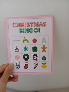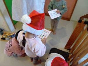 その後はクリスマスビンゴを楽しみました!園内を探し回って描かれたイラストのクリスマスグッズは見つけられるかな?