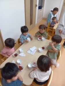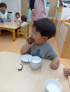 サンタさんのペープサートのお楽しみを見たあとは、みんなお待ちかねのおやつ!