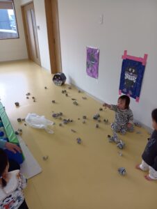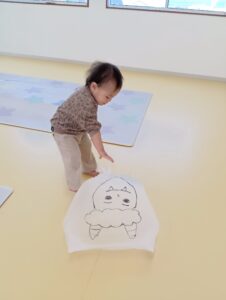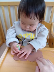 「これから鬼さんを作るよ~!」というと、「おに!おに!」と言う子や両手の人差し指を自分の頭に乗せ、鬼さんポーズを見せてくれる子がいて、可愛かったです💓