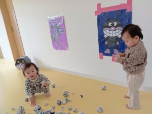 新聞で作ったボールを「えい!」と投げる子や、「ぱんぱーんち」と言ってパンチしてやっつける子がいました!