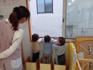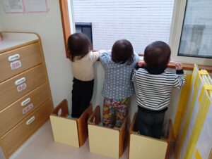 まだ少し雪が降っており外はとっても寒い日のお部屋遊び中、ふと窓の外を見る子どもたち。外の様子が気になっていました。保育士が踏み台を持ってくると3人で仲良く窓の外を見始めていました!💗風が吹くたびに「きゃ~!」とほっぺを抑えて喜んでいました😊