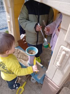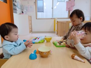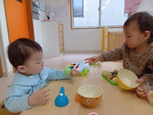 お友達とのごっこ遊びも見られました💗これはアイス屋さんごっこをしているシーンです。お客さん役とお店屋さん役になりきって「ちょーだい」、「どうぞ」、「あっとー!(ありがとう)」と、会話も交えながらしっかりと遊びが成立していました!🍦